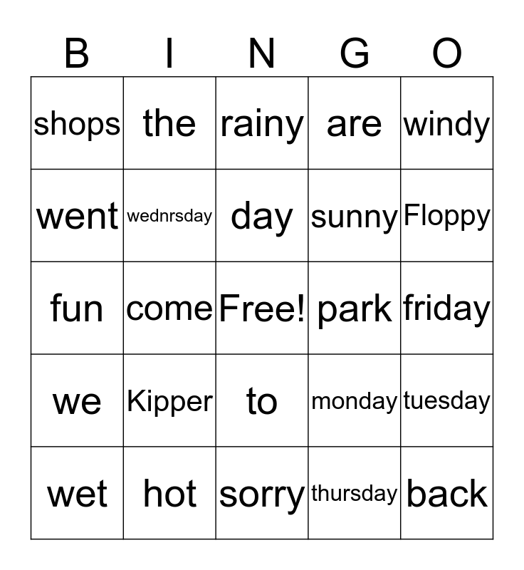 This bingo card has a free space and 24 words: Kipper, hot, day, wet, windy, shops, went, the, park, to, sunny, fun, monday, tuesday, wednrsday, thursday, friday, rainy, Floppy, come, back, we, are and sorry.
