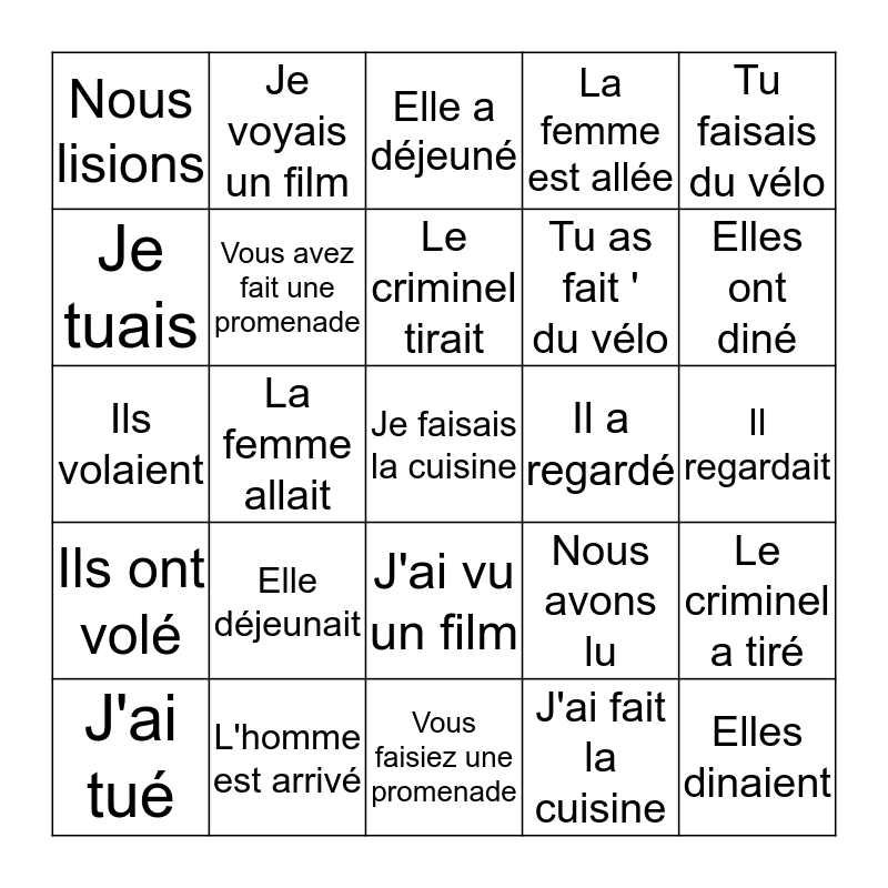 This bingo card has 25 words: Elle déjeunait, Vous faisiez une promenade, Le criminel tirait, J'ai tué, Tu faisais du vélo, Nous lisions, Je tuais, Je voyais un film, Il a regardé, J'ai vu un film, Tu as fait ' du vélo, Ils volaient, Nous avons lu, Le criminel a tiré, Vous avez fait une promenade, Elles dinaient, Il regardait, Elle a déjeuné, Elles ont diné, La femme allait, Je faisais la cuisine, L'homme est arrivé, Ils ont volé, La femme est allée and J'ai fait la cuisine.
