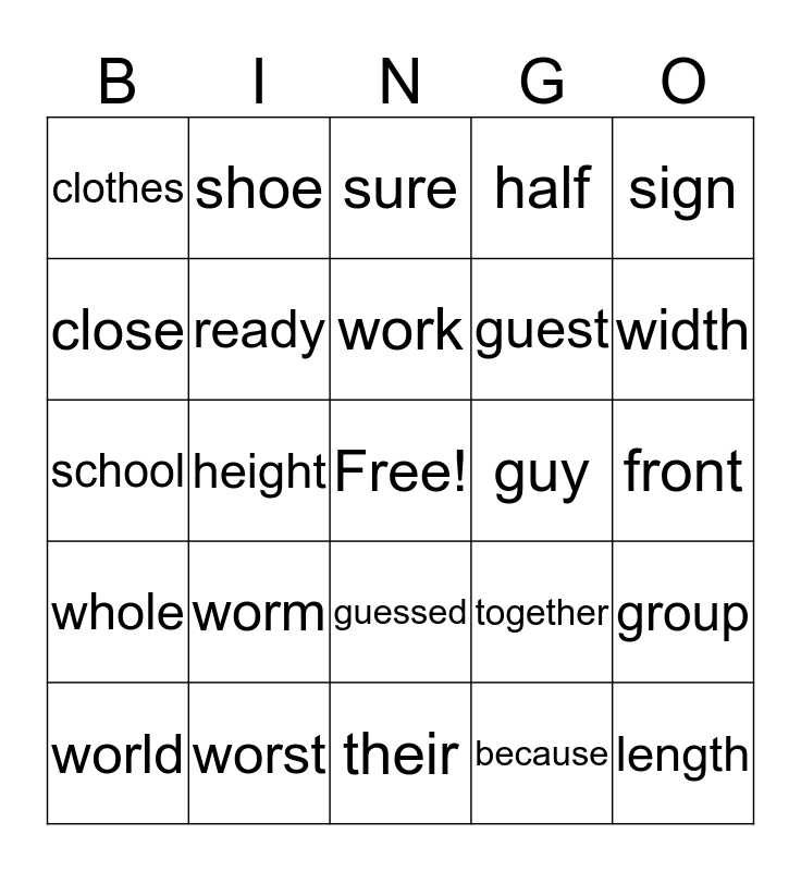 This bingo card has a free space and 24 words: worm, worst, work, world, sign, clothes, close, shoe, guy, guessed, guest, school, together, group, ready, because, front, sure, width, height, length, whole, half and their.