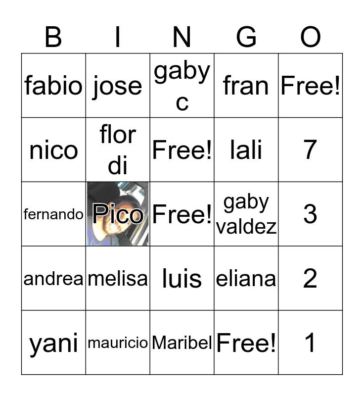 This bingo card has 2 images and 40 words: Ale, Pico, meli, eliana, 1, fernando, flor di, gaby f, lali, 2, fabio, jose, Free!, Free!, 3, nico, leticia, gaby c, mati, Free!, andrea, mauricio, Free!, gaby valdez, 5, sabrina, guido, pablo, gonzalo, 6, vicky, melisa, luis, maria jose, 7, yani, mara, Maribel, fran and 4.