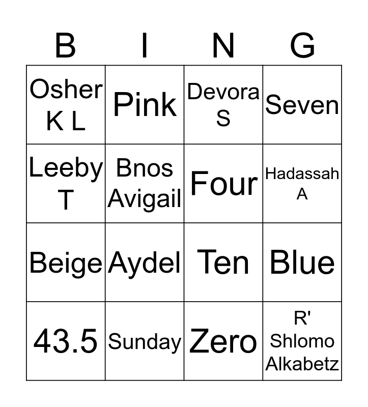 This bingo card has 16 words: Sunday, Blue, Devora S, Osher K L, Beige, Pink, Ten, Zero, Leeby T, Bnos Avigail, 43.5, Seven, Aydel, Hadassah A, Four and R' Shlomo Alkabetz.