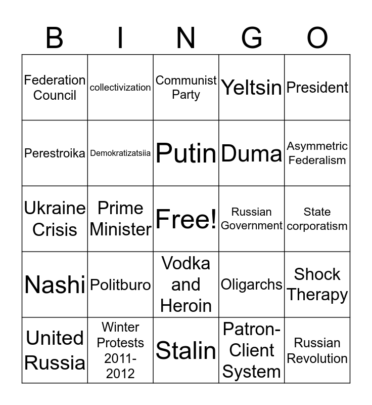 This bingo card has a free space and 51 words: Westernization, Russian Revolution, Lenin, Stalin, Politburo, nomenklaura, collectivization, Gorbachev, Perestroika, Glastnost, Demokratizatsiia, Yeltsin, Shock Therapy, Oligarchs, Russian Constitution, Chechen Civil War, Putin, Russian Government, Mixed Presidential Parliamentary System, President, Prime Minister, Patron-Client System, Federation Council, Duma, Constitutional Court, Supreme Court, Asymmetric Federalism, Politics, United Russia, Communist Party, Liberal Democratic Party, Two-ballot system, Mixed SMD/PR, Proportional Representation, Minimum Threshold, Winter Protests 2011-2012, Society, Chechnya, Beslan School Massacre, Russian Orthodox Church, State corporatism, Nashi, Public Policy, Rentier State, Gazprom, CIS, Ukraine Crisis, Social Media, Political Socialization, Vodka and Heroin and Gay Rights.