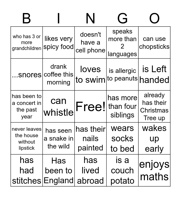 This bingo card has a free space and 53 words: hasn't had breakfast today, enjoys maths, won a contest, is a couch potato, has seen a snake in the wild, watches more than one hour of TV every day, likes very spicy food, was born in January, ...snores, does not like broccoli, drank coffee this morning, is afraid of spiders, wakes up early, wears socks to bed, can play a musical instrument, has had stitches, loves to swim, has more than four siblings, is an only child, can use chopsticks, can whistle, was born out of the country, is allergic to peanuts, who has 3 or more grandchildren, was born in Lockport, Has been to England, Has a pet dog, Was born on a Nation Holiday, prefers tea over coffee, is Left handed, loves reading poetry, can write with both hands (ambidextrous), has a sloppy signature, can do a cartwheel, drinks their coffee black, has a twin, speaks more than 2 languages, has lived abroad, doesn't have a cell phone, has visited more than 20 states in the United States, doesn't have a Facebook, is younger than you, already has their Christmas Tree up, has the same birthday as you, can't cook, has their nails painted, is the same height as you, has green eyes, has been to a concert in the past year, never leaves the house without lipstick, has served in the military, has volunteered this month and is going out of town for Thanksgiving.