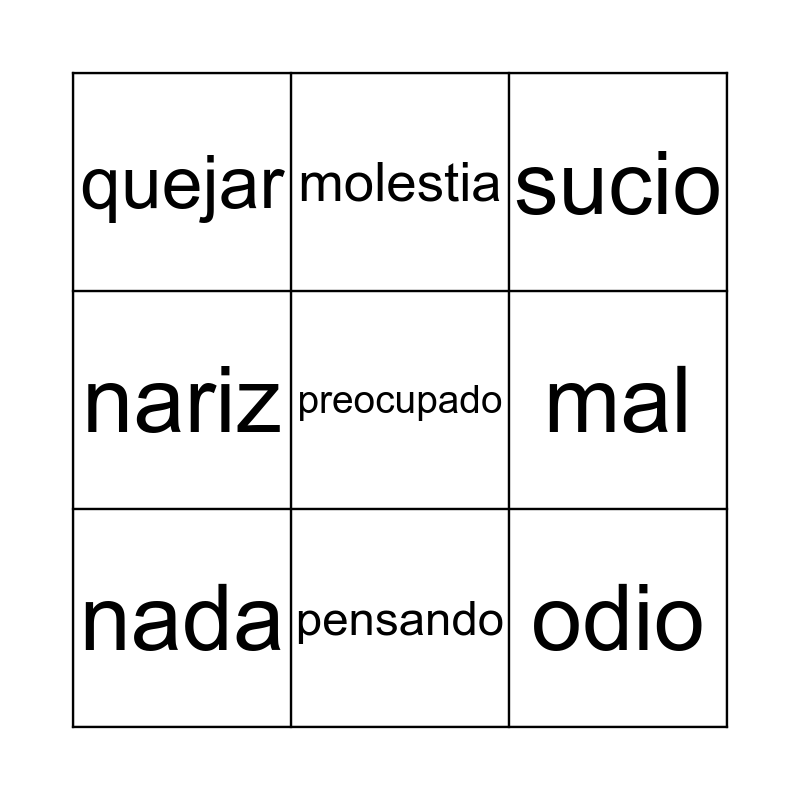 This bingo card has a free space and 8 words: mal, sucio, molestia, nada, quejar, odio, nariz and pensando.