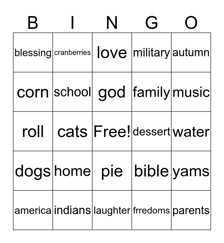 This bingo card has a free space and 24 words: home, indians, god, america, autumn, blessing, corn, cranberries, dessert, pie, family, roll, bible, yams, school, frredoms, water, love, music, cats, parents, dogs, military and laughter.