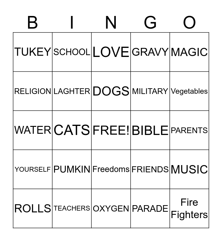 This bingo card has a free space and 24 words: PUMKIN, TEACHERS, DOGS, ROLLS, MAGIC, TUKEY, RELIGION, SCHOOL, BIBLE, Freedoms, MILITARY, WATER, FRIENDS, MUSIC, LAGHTER, PARADE, PARENTS, LOVE, Vegetables, CATS, Fire Fighters, YOURSELF, GRAVY and OXYGEN.