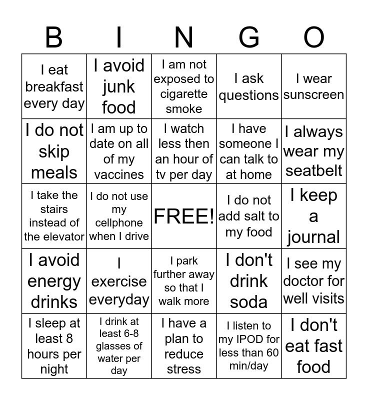 This bingo card has a free space and 24 words: I exercise everyday, I drink at least 6-8 glasses of water per day, I watch less then an hour of tv per day, I sleep at least 8 hours per night, I wear sunscreen, I eat breakfast every day, I do not skip meals, I avoid junk food, I do not add salt to my food, I park further away so that I walk more, I have someone I can talk to at home, I take the stairs instead of the elevator, I don't drink soda, I see my doctor for well visits, I am up to date on all of my vaccines, I listen to my IPOD for less than 60 min/day, I keep a journal, I am not exposed to cigarette smoke, I always wear my seatbelt, I do not use my cellphone when I drive, I don't eat fast food, I avoid energy drinks, I ask questions and I have a plan to reduce stress.
