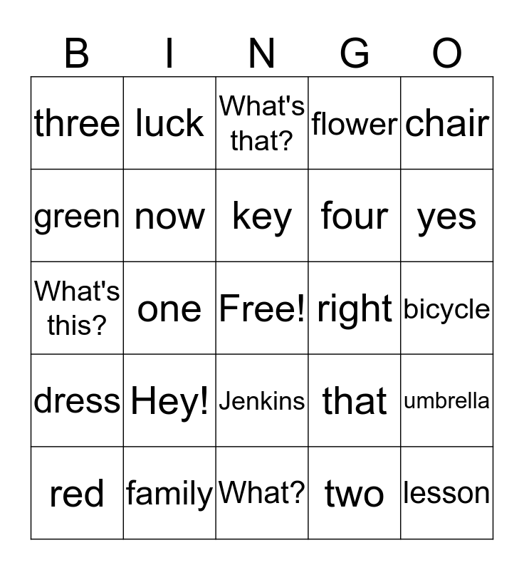 This bingo card has a free space and 49 words: listening, lesson, green, What?, Hey!, good, luck, wheel, green, OK, now, flower, umbrella, that, grey, bird, key, right, silver, chair, one, two, three, four, table, yes, red, pencil, Jenkins, dress, desk, umbrella, nephew, camera, family, black, Karen, and, bicycle, colour, What colour?, white, an, dress, What's this?, What's that?, Whose is it?, What colour is it? and now.
