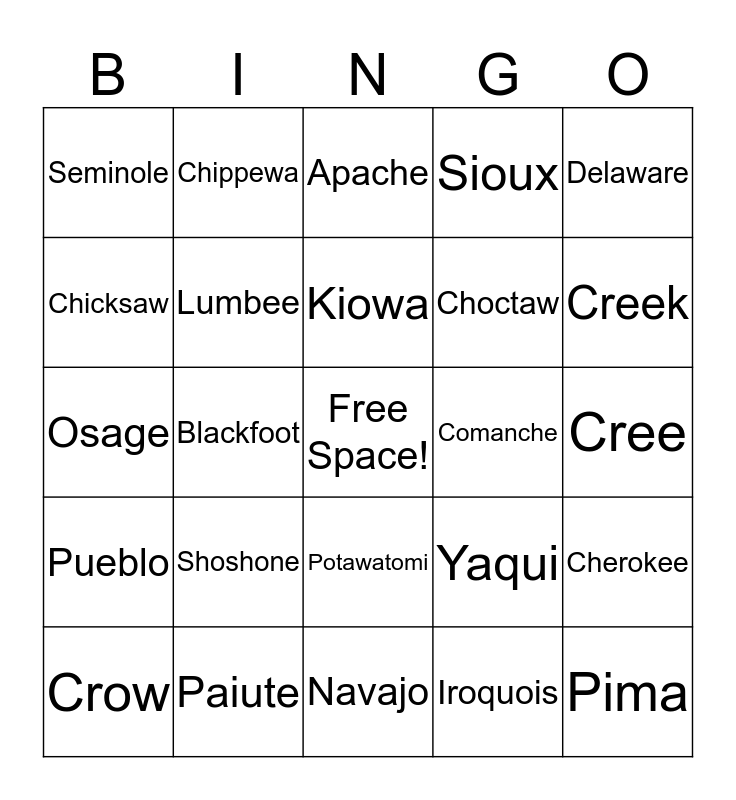 This bingo card has a free space and 24 words: Crow, Shoshone, Kiowa, Iroquois, Delaware, Seminole, Chippewa, Apache, Comanche, Cree, Osage, Lumbee, Yaqui, Cherokee, Chicksaw, Paiute, Navajo, Sioux, Creek, Pueblo, Blackfoot, Potawatomi, Choctaw and Pima.