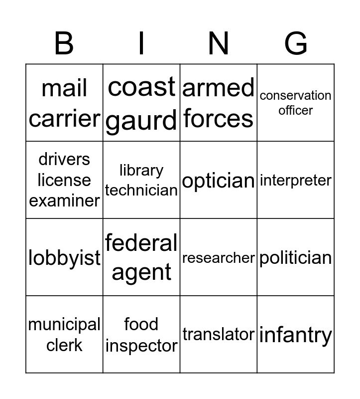 This bingo card has 16 words: food inspector, politician, armed forces, mail carrier, lobbyist, coast gaurd, researcher, translator, drivers license examiner, library technician, municipal clerk, conservation officer, federal agent, interpreter, optician and infantry.