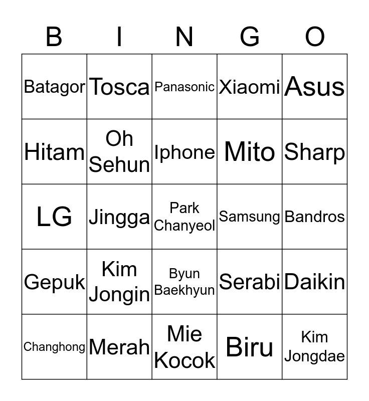 This bingo card has a free space and 24 words: Kim Jongin, Merah, Iphone, Changhong, Asus, Batagor, Hitam, Tosca, Samsung, Byun Baekhyun, Mito, LG, Serabi, Daikin, Oh Sehun, Biru, Bandros, Panasonic, Sharp, Jingga, Kim Jongdae, Gepuk, Xiaomi and Mie Kocok.