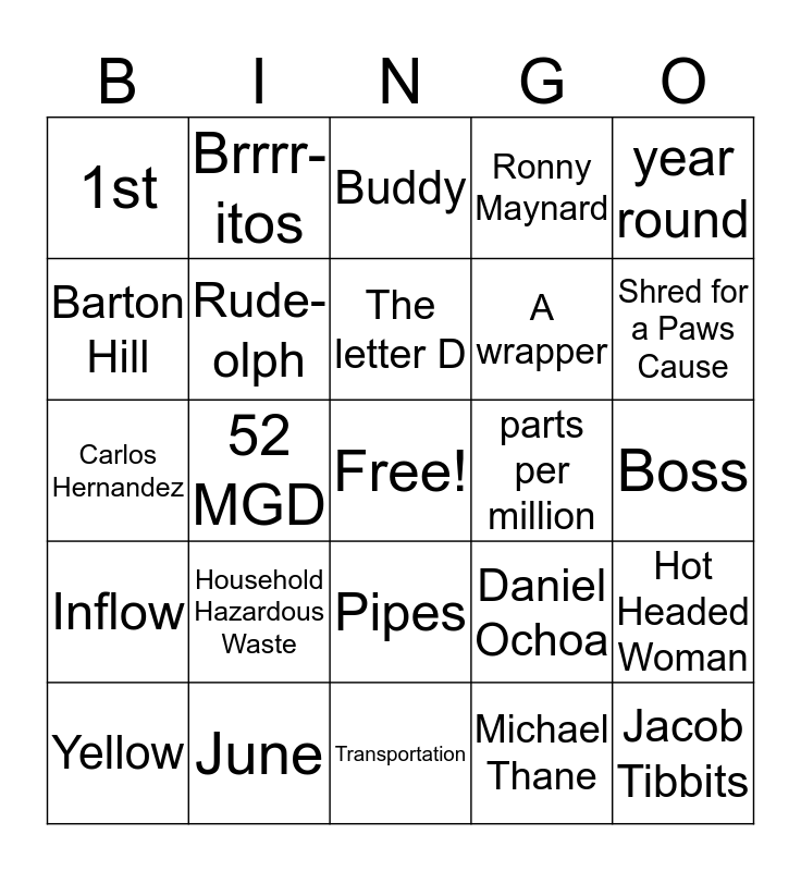 This bingo card has a free space and 77 words: Welfy, Comet, Buddy, 8.34 lbs, any day, Allison & Robert Rivera, Snowmobile, 119, Cam Tate, 31, all of them, Magic Chambers, The letter D, Barton Hill, Cisco, 52 MGD, We do, Jacob Tibbits, 42 MG, year round, Brandon Pritchett, Carlos Hernandez, Rude-olph, Brrrr-itos, Ronny Maynard, Chris Spencer, 11, 1.28 gallons, Ashley Medel, 2, A well, Stillhouse Hollow, Cody Ishman, Daniel Ochoa, Shred for a Paws Cause, A wrapper, Joel Rogers, Christy, Boss, Michael Thane, Morocco, Anja, Amanda Taylor, Me, Nobody, Jorae, Yellow, 1st, backflow, David Freireich, Round Rock, Pipes, 20, 15,000, Kyle Peterson, 7, David & Hayden, 10, water, Dasher, Household Hazardous Waste, 48 inches, Ice caps, A snowball, 140,000, Eddie Zapata, Max Panilo, parts per million, Wastewater, Grease, December, Hot Headed Woman, Inflow, June, Spring Clean Up Week, Transportation and Craig Morgan.