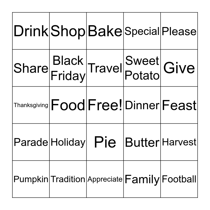 This bingo card has a free space and 31 words: Appreciate, Hungry, Food, Thirsty, Drink, Bake, Black Friday, Butter, Dinner, Family, Feast, Football, Friends, Full, Give, Gravy, Harvest, Holiday, Parade, Pie, Please, Potato, Pumpkin, Shop, Sweet Potato, Share, Special, Thanksgiving, Tradition, Travel and Turkey.