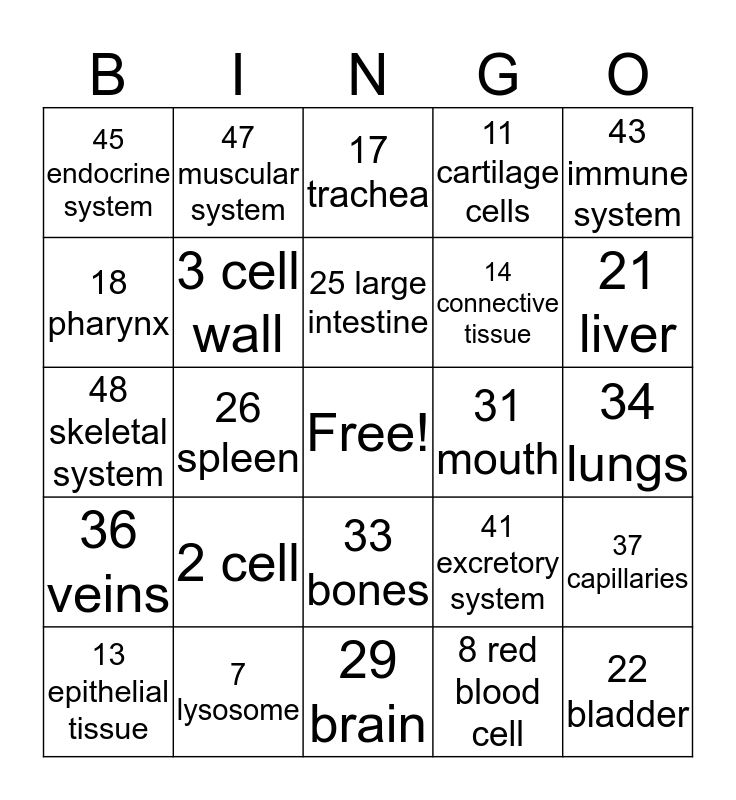 This bingo card has a free space and 24 words: 2 cell, 7 lysosome, 25 large intestine, 13 epithelial tissue, 43 immune system, 45 endocrine system, 18 pharynx, 47 muscular system, 31 mouth, 33 bones, 14 connective tissue, 48 skeletal system, 41 excretory system, 37 capillaries, 3 cell wall, 8 red blood cell, 34 lungs, 17 trachea, 21 liver, 26 spleen, 22 bladder, 36 veins, 11 cartilage cells and 29 brain.