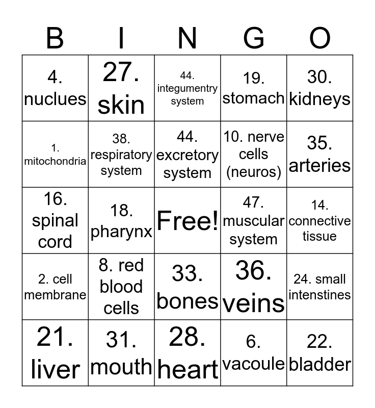 This bingo card has a free space and 24 words: 8. red blood cells, 31. mouth, 44. excretory system, 21. liver, 30. kidneys, 4. nuclues, 1. mitochondria, 27. skin, 47. muscular system, 33. bones, 10. nerve cells (neuros), 16. spinal cord, 36. veins, 24. small intenstines, 38. respiratory system, 6. vacoule, 14. connective tissue, 44. integumentry system, 35. arteries, 18. pharynx, 22. bladder, 2. cell membrane, 19. stomach and 28. heart.