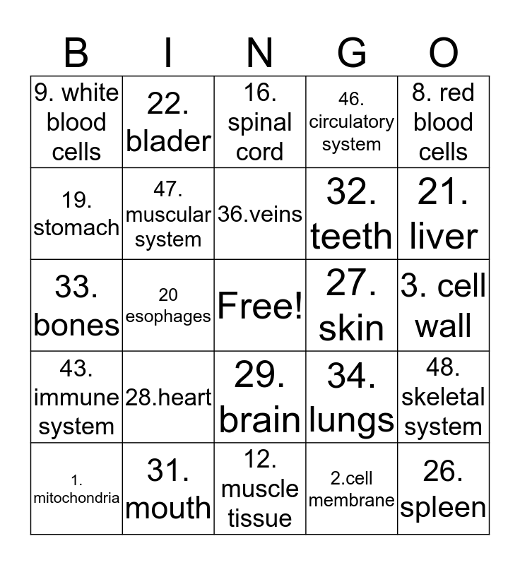This bingo card has a free space and 24 words: 28.heart, 31. mouth, 36.veins, 1. mitochondria, 8. red blood cells, 9. white blood cells, 19. stomach, 22. blader, 27. skin, 29. brain, 32. teeth, 33. bones, 34. lungs, 48. skeletal system, 47. muscular system, 2.cell membrane, 3. cell wall, 16. spinal cord, 21. liver, 20 esophages, 26. spleen, 43. immune system, 46. circulatory system and 12. muscle tissue.