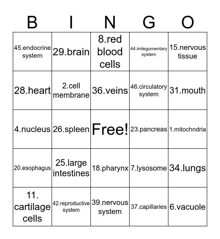This bingo card has a free space and 24 words: 25.large intestines, 42.reproductive system, 36.veins, 11. cartilage cells, 15.nervous tissue, 45.endocrine system, 28.heart, 29.brain, 23.pancreas, 18.pharynx, 46.circulatory system, 4.nucleus, 7.lysosome, 34.lungs, 2.cell membrane, 37.capillaries, 1.mitochndria, 8.red blood cells, 31.mouth, 26.spleen, 6.vacuole, 20.esophagus, 44.imtegumentary system and 39.nervous system.