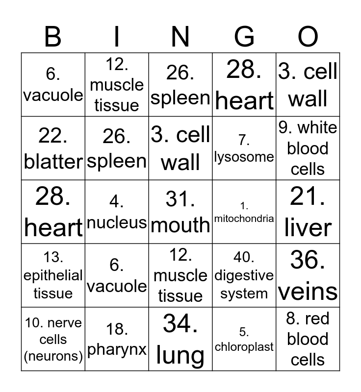 This bingo card has a free space and 48 words: 33. bone, 8. red blood cells, 21. liver, 34. lung, 6. vacuole, 2. cell membrain, 12. muscle tissue, 19.stomach, 22. blatter, 27. skin, 26. spleen, 28. heart, 36. veins, 40. digestive system, 16. spinal cord, 35. arteries, 3. cell wall, 1. mitochondria, 2. cell membrane, 3. cell wall, 4. nucleus, 5. chloroplast, 6. vacuole, 7. lysosome, 8. red blood cells, 9. white blood cells, 10. nerve cells (neurons), 11. cartilage cells, 12. muscle tissue, 13. epithelial tissue, 14. connective tissue, 15. nervous tissue, 16. spinal cord, 17. trachea, 18. pharynx, 19. stomach, 20. esophagus, 21. liver, 22. bladder, 23. pancreas, 24. small intestines, 25. large intestines, 26. spleen, 27. skin, 28. heart, 29. brain, 30. kidneys and 31. mouth.