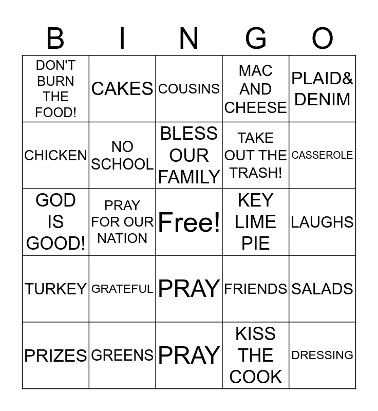 ⚠ This card has duplicate items: DRESSING (2), GRAVY (2), PRAY (2), CAKES (2), PIES (2), FAMILY (2), LAUGHS (2), FULL AND SLEEPY (2), GOD IS GOOD! (2)