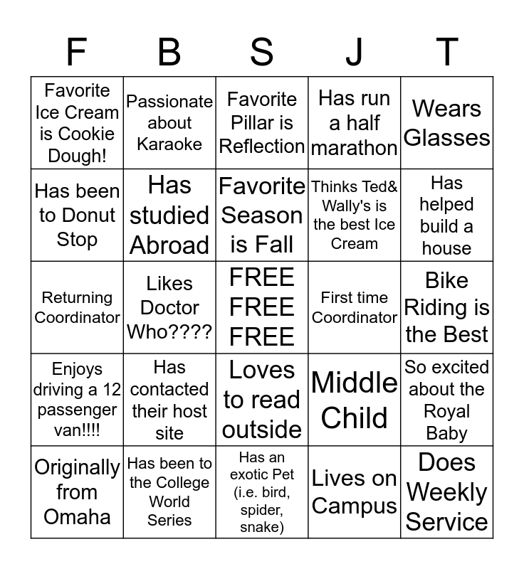 This bingo card has a free space and 24 words: Has contacted their host site, Has been to the College World Series, Favorite Season is Fall, Originally from Omaha, Wears Glasses, Favorite Ice Cream is Cookie Dough!, Has been to Donut Stop, Passionate about Karaoke, First time Coordinator, Loves to read outside, Thinks Ted& Wally's is the best Ice Cream, Returning Coordinator, Middle Child, So excited about the Royal Baby, Has studied Abroad, Lives on Campus, Bike Riding is the Best, Favorite Pillar is Reflection, Has helped build a house, Likes Doctor Who????, Does Weekly Service, Enjoys driving a 12 passenger van!!!!, Has run a half marathon and Has an exotic Pet (i.e. bird, spider, snake).