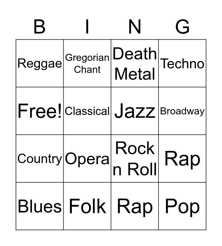 This bingo card has 16 words: Folk, Rap, Death Metal, Reggae, Country, Gregorian Chant, Rock n Roll, Rap, Free!, Classical, Blues, Techno, Opera, Broadway, Jazz and Pop.