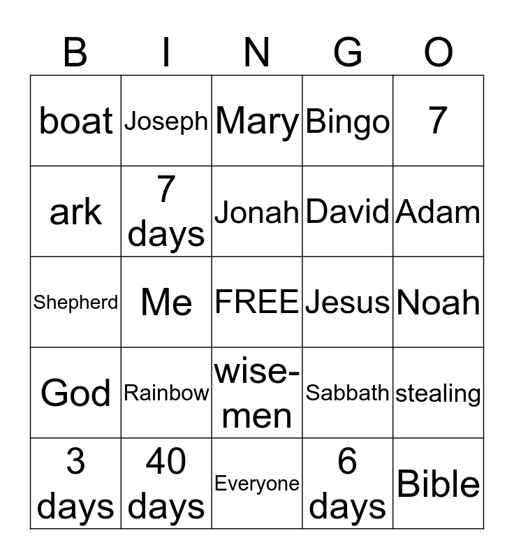 This bingo card has a free space and 24 words: Rainbow, 40 days, Jonah, 3 days, 7, boat, ark, Joseph, Jesus, wise-men, David, Shepherd, Sabbath, stealing, 7 days, 6 days, Noah, Mary, Adam, Me, Bible, God, Bingo and Everyone.