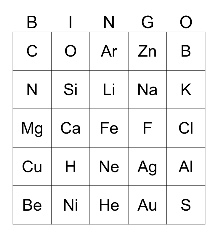 This bingo card has 25 words: H, He, Li, Be, B, C, N, O, F, Ne, Na, Mg, Ag, Al, Si, S, Cl, Ar, K, Ca, Fe, Ni, Cu, Zn and Au.