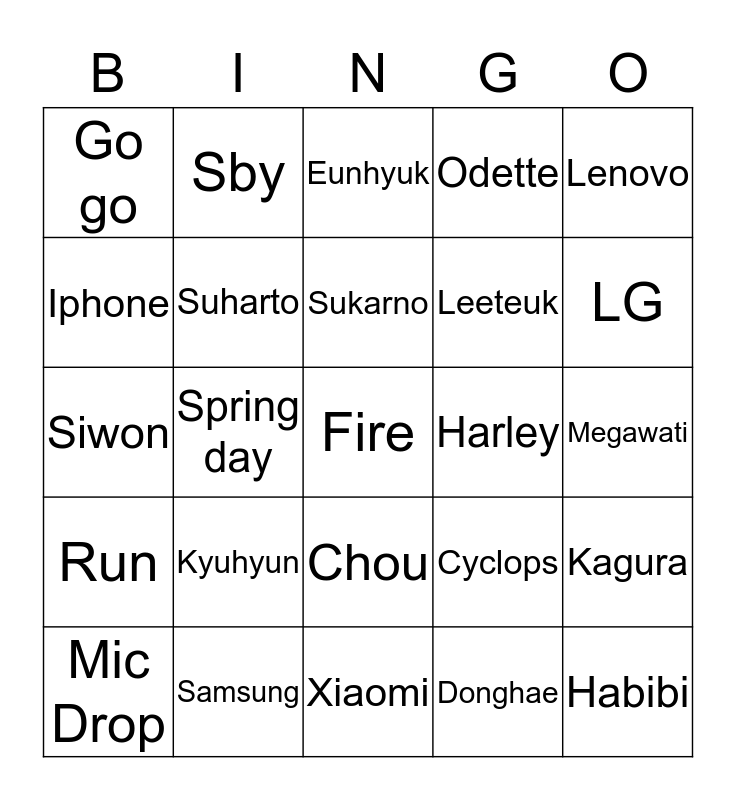 This bingo card has a free space and 24 words: Kyuhyun, Samsung, Sukarno, Mic Drop, Lenovo, Go go, Iphone, Sby, Harley, Chou, Leeteuk, Siwon, Cyclops, Kagura, Suharto, Donghae, Megawati, Eunhyuk, LG, Spring day, Habibi, Run, Odette and Xiaomi.