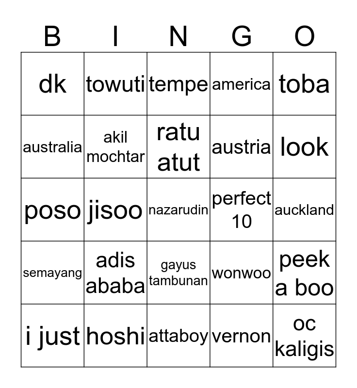 This bingo card has a free space and 24 words: adis ababa, hoshi, ratu atut, i just, toba, dk, australia, towuti, perfect 10, gayus tambunan, austria, poso, wonwoo, peek a boo, akil mochtar, vernon, auckland, tempe, look, jisoo, oc kaligis, semayang, america and attaboy.