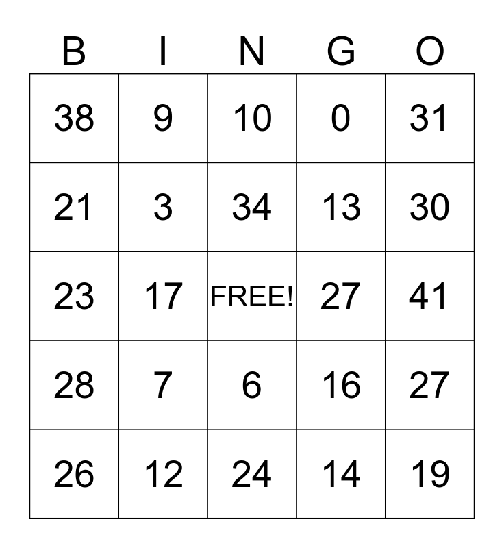 This bingo card has a free space and 24 words: 7, 12, 34, 26, 31, 38, 21, 9, 27, 6, 13, 23, 16, 27, 3, 14, 41, 10, 30, 17, 19, 28, 0 and 24.