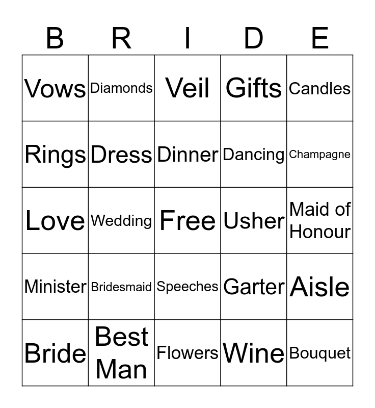 This bingo card has a free space and 29 words: Bride, Groom, Wedding, Bliss, Vows, Veil, Dress, Bridesmaid, Usher, Best Man, Maid of Honour, Bouquet, Flowers, Wine, Champagne, Toasts, Speeches, Minister, Candles, Love, Garter, Music, Dancing, Rings, Gifts, Diamonds, Aisle, Dinner and Honeymoon.