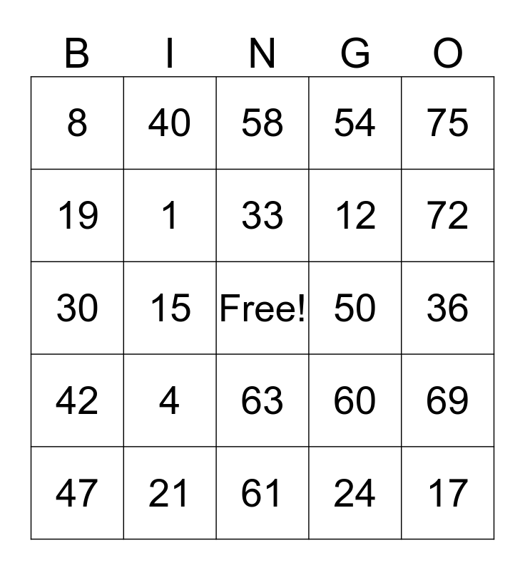 This bingo card has a free space and 24 words: 4, 21, 33, 47, 75, 8, 19, 40, 50, 63, 12, 30, 60, 69, 1, 24, 36, 58, 72, 15, 17, 42, 54 and 61.
