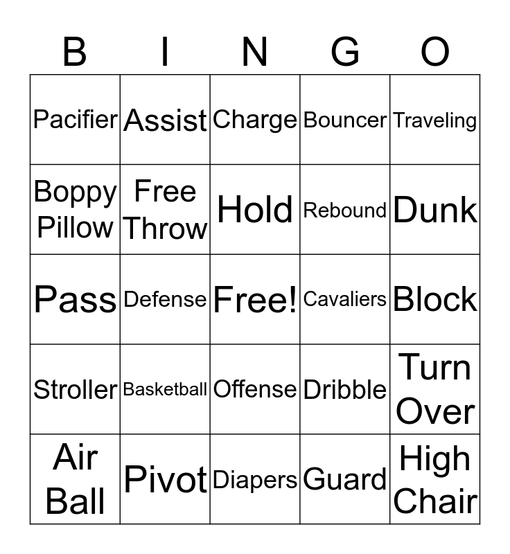This bingo card has a free space and 24 words: Basketball, Pivot, Hold, Air Ball, Traveling, Pacifier, Boppy Pillow, Assist, Cavaliers, Offense, Rebound, Pass, Dribble, Turn Over, Free Throw, Guard, Block, Charge, Dunk, Defense, High Chair, Stroller, Bouncer and Diapers.