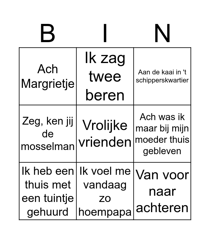 This bingo card has a free space and 8 words: Ach was ik maar bij mijn moeder thuis gebleven, Aan de kaai in 't schipperskwartier, Ik zag twee beren, Ik heb een thuis met een tuintje gehuurd, Ach Margrietje, Van voor naar achteren, Zeg, ken jij de mosselman and Ik voel me vandaag zo hoempapa.