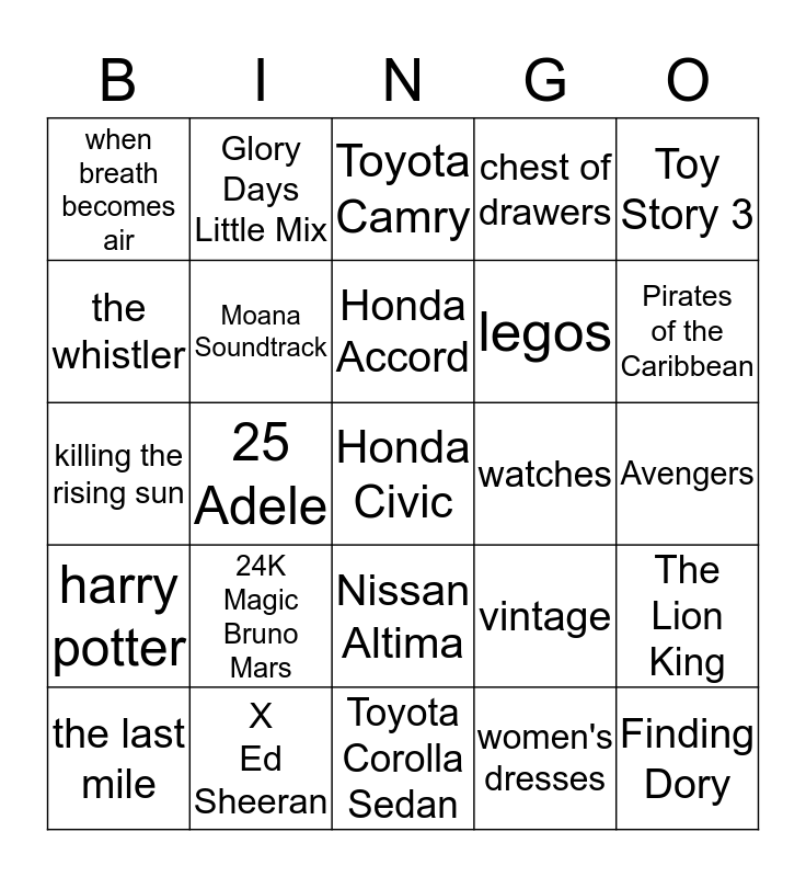 This bingo card has 25 words: harry potter, X Ed Sheeran, Honda Civic, women's dresses, Toy Story 3, when breath becomes air, Glory Days Little Mix, Toyota Camry, watches, The Lion King, the whistler, Moana Soundtrack, Toyota Corolla Sedan, vintage, Pirates of the Caribbean, the last mile, 25 Adele, Honda Accord, legos, Avengers, killing the rising sun, 24K Magic Bruno Mars, Nissan Altima, chest of drawers and Finding Dory.