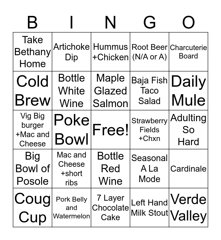 This bingo card has a free space and 24 words: Mac and Cheese +short ribs, Pork Belly and Watermelon, Maple Glazed Salmon, Coug Cup, Charcuterie Board, Take Bethany Home, Cold Brew, Artichoke Dip, Strawberry Fields +Chxn, Bottle Red Wine, Baja Fish Taco Salad, Vig Big burger +Mac and Cheese, Seasonal A La Mode, Cardinale, Bottle White Wine, Left Hand Milk Stout, Adulting So Hard, Hummus +Chicken, Daily Mule, Poke Bowl, Verde Valley, Big Bowl of Posole, Root Beer (N/A or A) and 7 Layer Chocolate Cake.