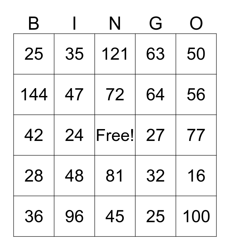 This bingo card has a free space and 24 words: 48, 96, 72, 36, 50, 25, 144, 35, 27, 81, 64, 42, 32, 16, 47, 25, 77, 121, 56, 24, 100, 28, 63 and 45.