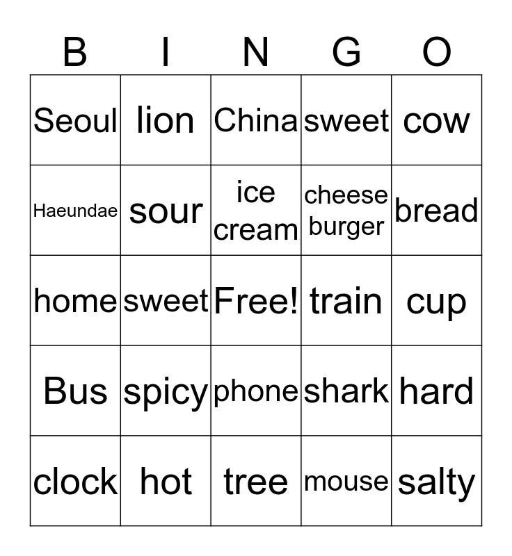 This bingo card has a free space and 37 words: kimchi, nuts, lemons, sour, hard, spicy, ice cream, perfect, cow, chocolate, sweet, sweet, salty, cup, Haeundae, Bus, Busan, China, phone, train, Seoul, bread, clock, tree, pig, mouse, lion, pizza, school, English, cold, hot, home, desk, shark, cheese burger and shoes.