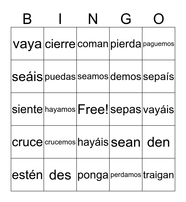 This bingo card has a free space and 24 words: crucemos, des, seamos, estén, paguemos, vaya, seáis, cierre, sepas, hayáis, demos, siente, sean, den, puedas, perdamos, vayáis, coman, sepaís, hayamos, traigan, cruce, pierda and ponga.