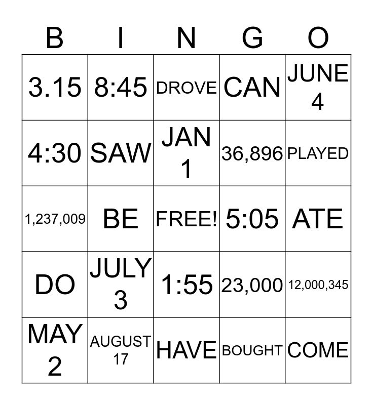 This bingo card has a free space and 24 words: JULY 3, AUGUST 17, JAN 1, MAY 2, JUNE 4, 3.15, 4:30, 8:45, 5:05, 1:55, 36,896, 1,237,009, 23,000, 12,000,345, SAW, BOUGHT, ATE, DROVE, PLAYED, BE, COME, DO, CAN and HAVE.