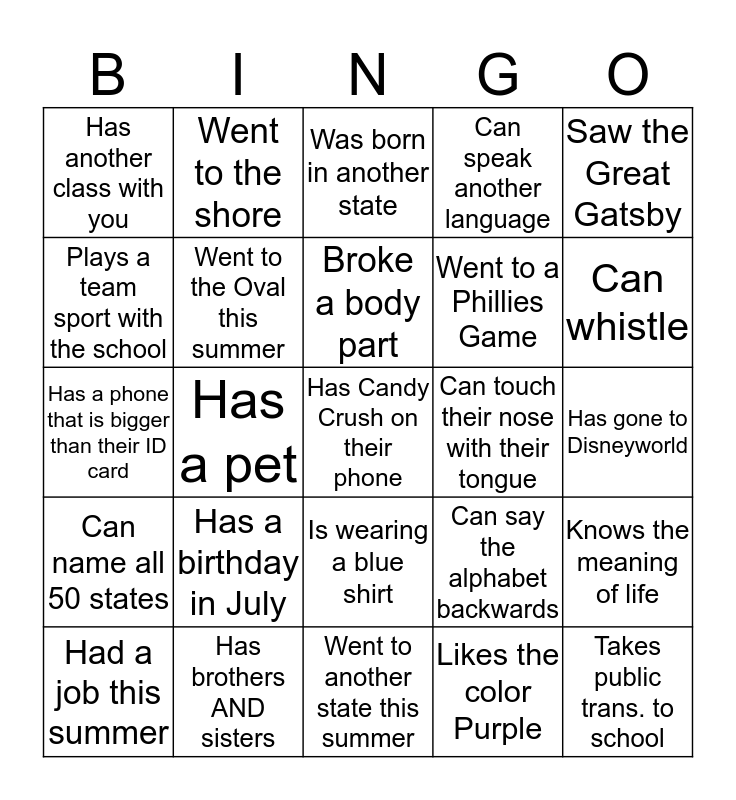 This bingo card has a free space and 24 words: Has a birthday in July, Has brothers AND sisters, Broke a body part, Had a job this summer, Saw the Great Gatsby, Has another class with you, Plays a team sport with the school, Went to the shore, Can touch their nose with their tongue, Is wearing a blue shirt, Went to a Phillies Game, Has a phone that is bigger than their ID card, Can say the alphabet backwards, Knows the meaning of life, Went to the Oval this summer, Likes the color Purple, Has gone to Disneyworld, Was born in another state, Can whistle, Has a pet, Takes public trans. to school, Can name all 50 states, Can speak another language and Went to another state this summer.