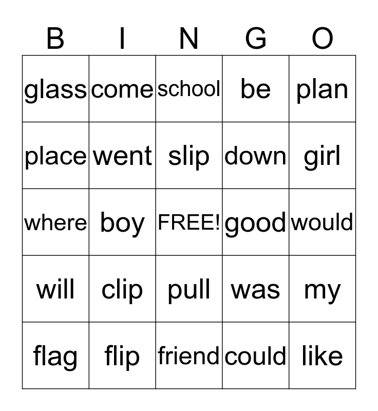 This bingo card has a free space and 24 words: clip, flip, slip, flag, plan, glass, place, come, good, pull, down, where, was, my, went, could, would, school, girl, boy, like, will, be and friend.