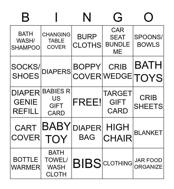 This bingo card has a free space and 24 words: BABY TOY, BATH TOWEL/ WASH CLOTH, BOPPY COVER, BOTTLE WARMER, SPOONS/ BOWLS, BATH WASH/ SHAMPOO, SOCKS/ SHOES, CHANGING TABLE COVER, TARGET GIFT CARD, DIAPER BAG, CRIB WEDGE, DIAPER GENIE REFILL, HIGH CHAIR, BLANKET, DIAPERS, CLOTHING, CRIB SHEETS, BURP CLOTHS, BATH TOYS, BABIES R US GIFT CARD, JAR FOOD ORGANIZE, CART COVER, CAR SEAT BUNDLE ME and BIBS.