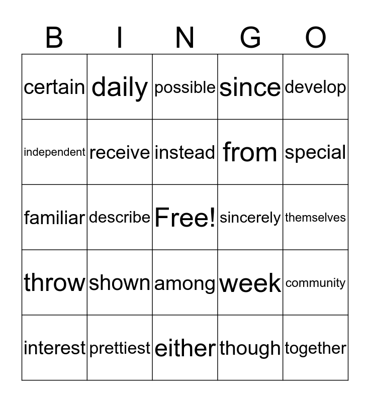 This bingo card has a free space and 24 words: shown, prettiest, instead, interest, develop, certain, independent, daily, sincerely, among, from, familiar, week, community, receive, though, themselves, possible, special, describe, together, throw, since and either.