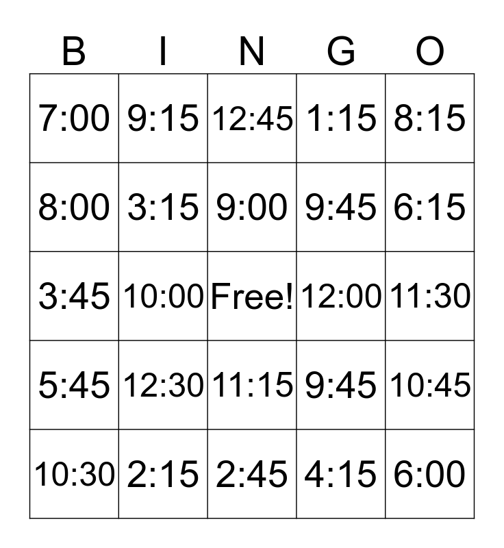 This bingo card has a free space and 24 words: 12:30, 2:15, 9:00, 10:30, 8:15, 7:00, 8:00, 9:15, 12:00, 11:15, 9:45, 3:45, 9:45, 10:45, 3:15, 4:15, 11:30, 12:45, 6:15, 10:00, 6:00, 5:45, 1:15 and 2:45.