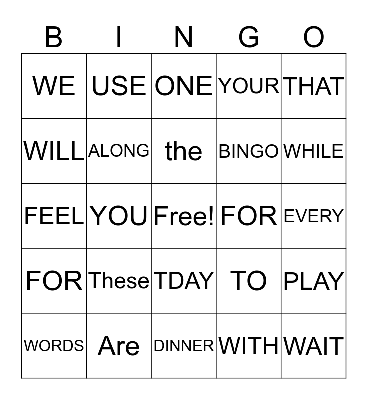 This bingo card has a free space and 24 words: These, Are, the, WORDS, THAT, WE, WILL, USE, FOR, TDAY, BINGO, FEEL, TO, PLAY, ALONG, WITH, EVERY, ONE, WHILE, YOU, WAIT, FOR, YOUR and DINNER.