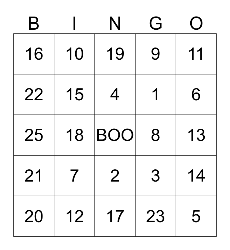 This bingo card has a free space and 24 words: 7, 12, 4, 20, 11, 16, 22, 10, 8, 2, 1, 25, 3, 14, 15, 23, 13, 19, 6, 18, 5, 21, 9 and 17.