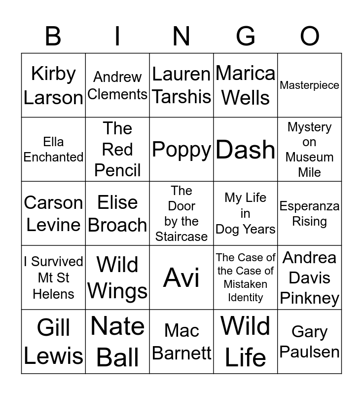 This bingo card has 25 words: Wild Wings, Mac Barnett, Poppy, Gill Lewis, Masterpiece, Kirby Larson, Ella Enchanted, Andrew Clements, My Life in Dog Years, Avi, Dash, Carson Levine, The Case of the Case of Mistaken Identity, Andrea Davis Pinkney, The Red Pencil, Gary Paulsen, Esperanza Rising, Lauren Tarshis, Mystery on Museum Mile, Elise Broach, The Door by the Staircase, Nate Ball, I Survived Mt St Helens, Marica Wells and Wild Life.