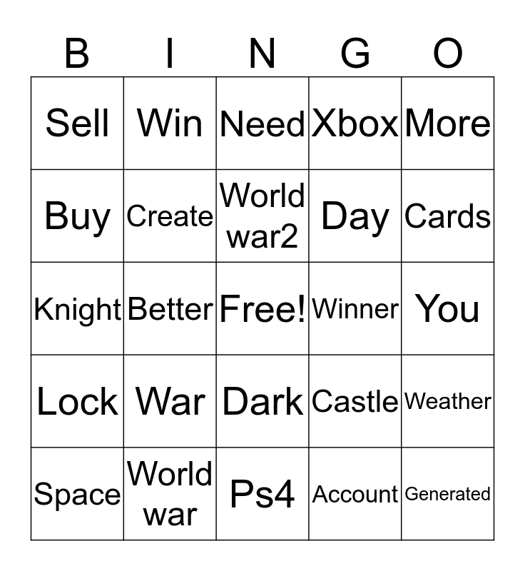This bingo card has a free space and 24 words: War, World war, World war2, Space, More, Sell, Buy, Win, Winner, Dark, Day, Knight, Castle, Weather, Create, Account, You, Need, Cards, Better, Generated, Lock, Xbox and Ps4.