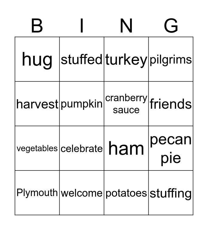 This bingo card has 37 words: celebration, cook, corn, cranberry sauce, Fall, family, friends, gravy, harvest, Mayflower, pecan pie, pilgrims, Plymouth, potatoes, pumpkin, stuffing, thanks, turkey, love, welcome, hug, celebrate, casserole, november, bake, corn, stuffed, tradition, cranberries, recipe, leftovers, cheerful, ham, leaves, thursday, vegetables and together.